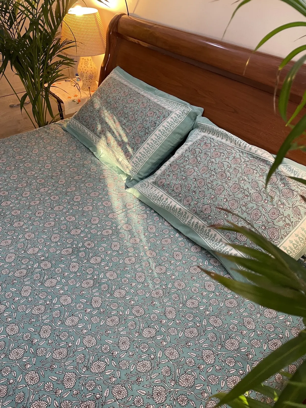 Bourbon rose floral motif cotton bedsheet in a soothing shade of green. Comes with two matching pillow cover.
