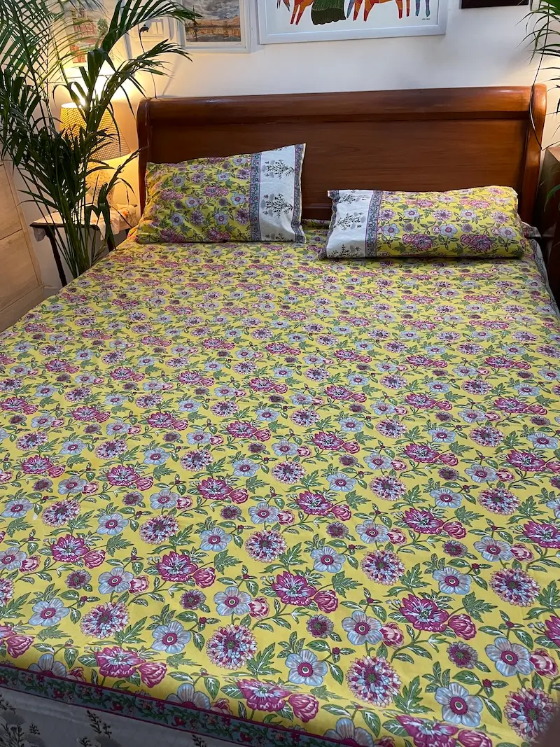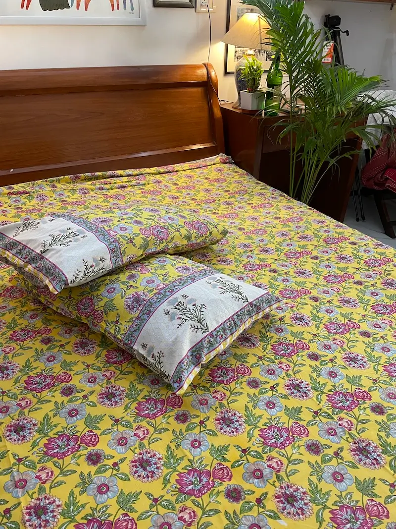 Bright yellow spring bloom floral motif cotton bedsheet. Comes with two matching pillow covers.