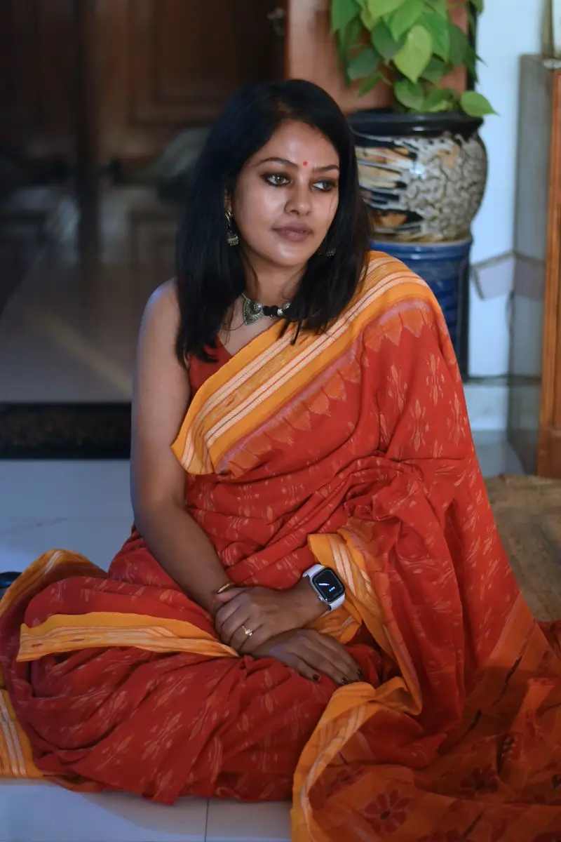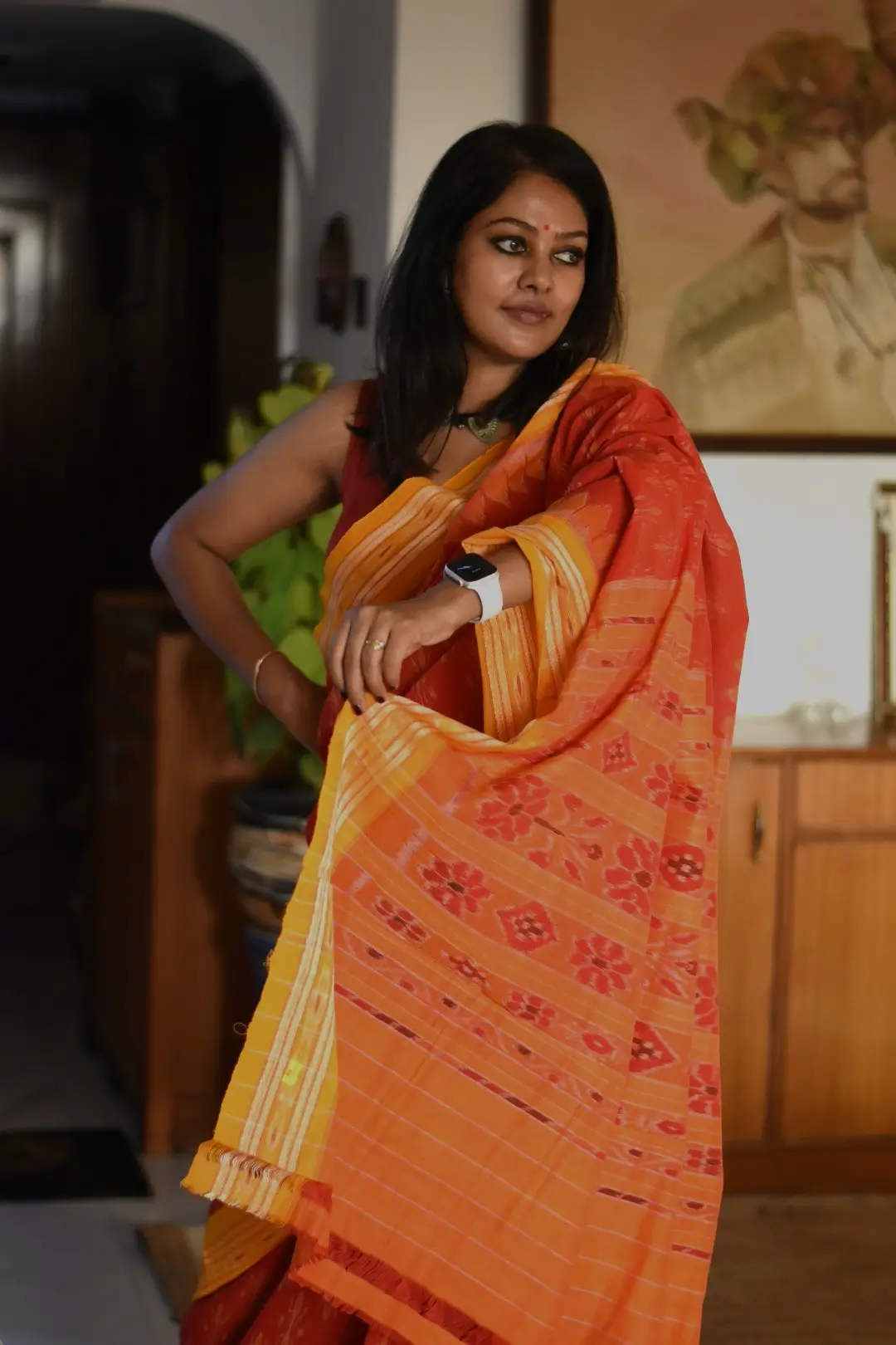 Red Sambalpuri Ikkat handwoven cotton saree. Border in contrast Yellow. No blouse piece.